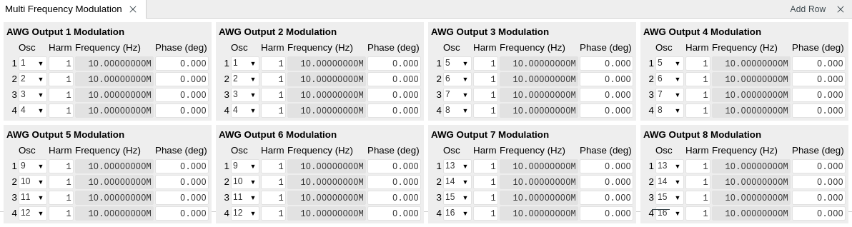 The Multi Frequency Modulation tab (see Figure 1) consists of 4 or 8 AWG Output Modulation panels corresponding to the AWG channels of the instrument.
