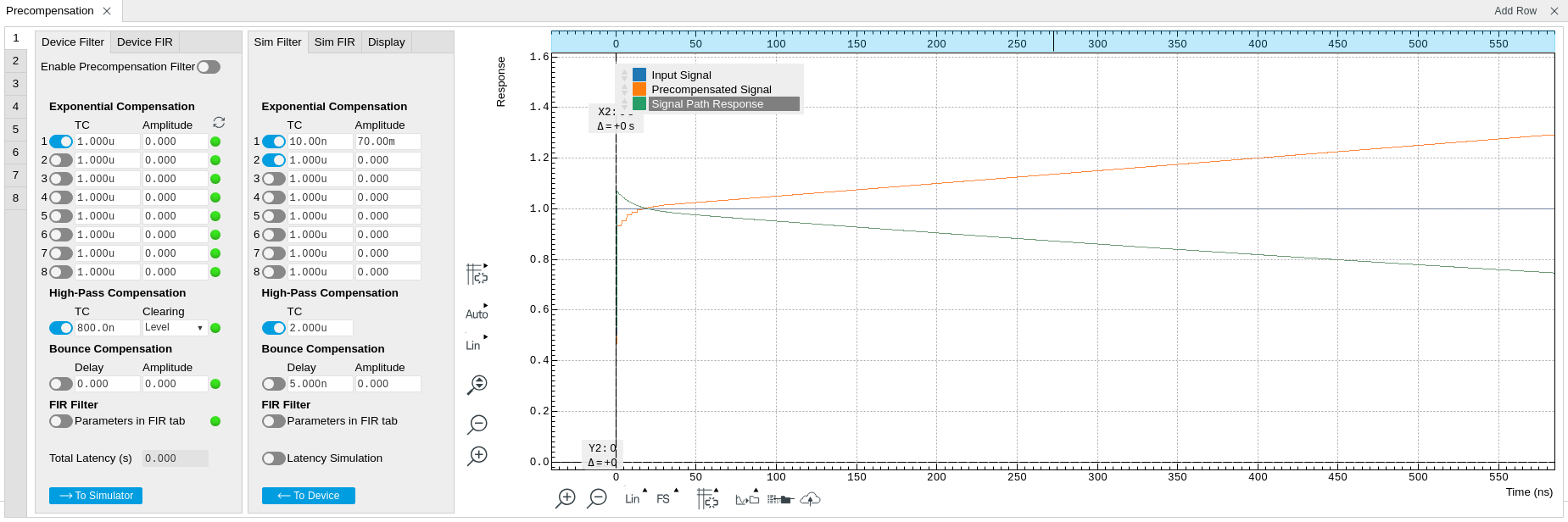 The right side of the configuration section as well as the display section represent the Precompensation Simulator. The Precompensation Simulator is a software-based tool to accurately model the hardware filter and thus allows one to find suitable filter parameters based on a step response measurement of the external circuit. The display section shows three simulated step response curves based on the currently s parameters in the Sim Filter sub-tab: