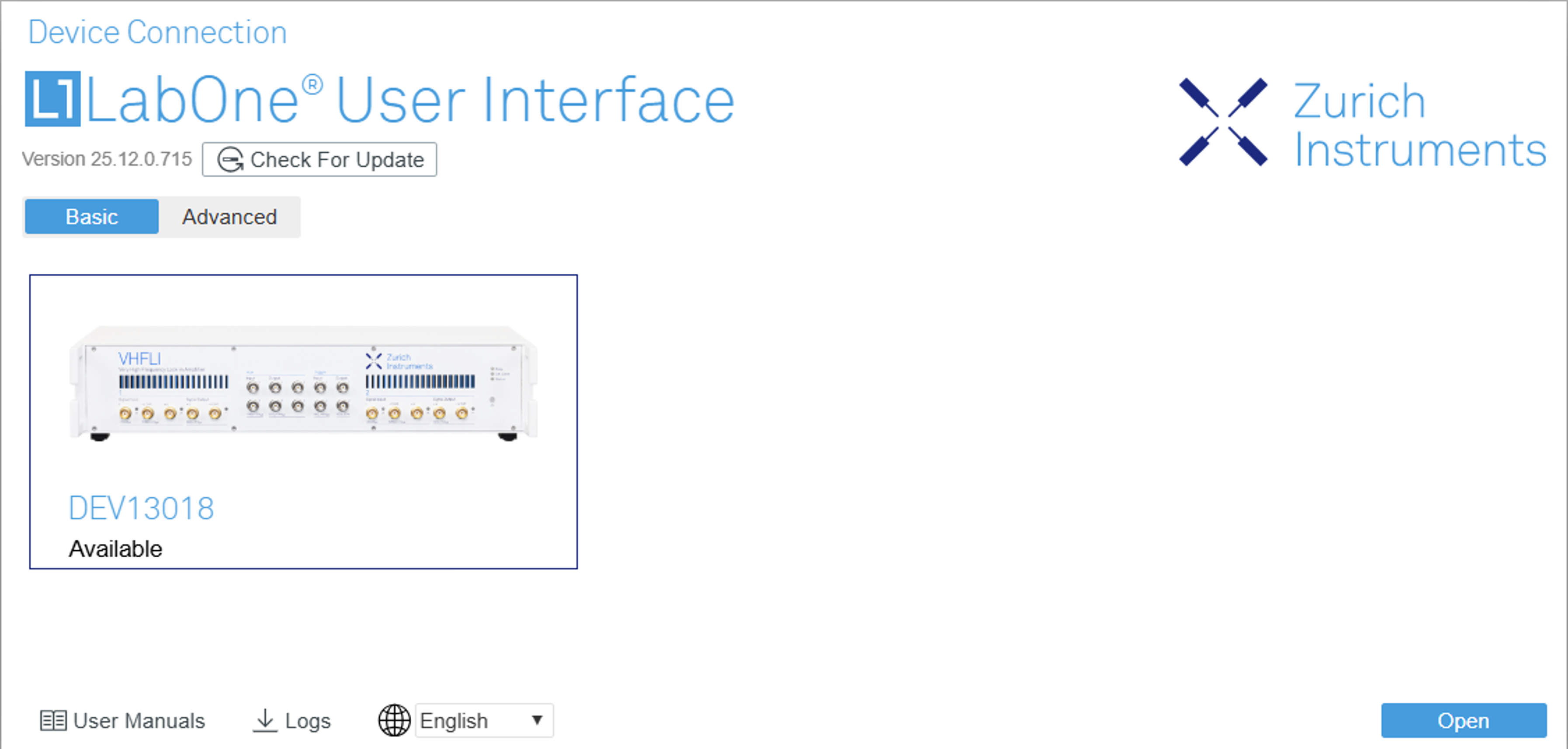 8. The LabOne User Interface start-up screen will appear. Click the Open button on the lower right of the page. The default configuration will be loaded and the first signals can be generated. If the user interface does not start up successfully, please refer to Connecting to the Instrument.